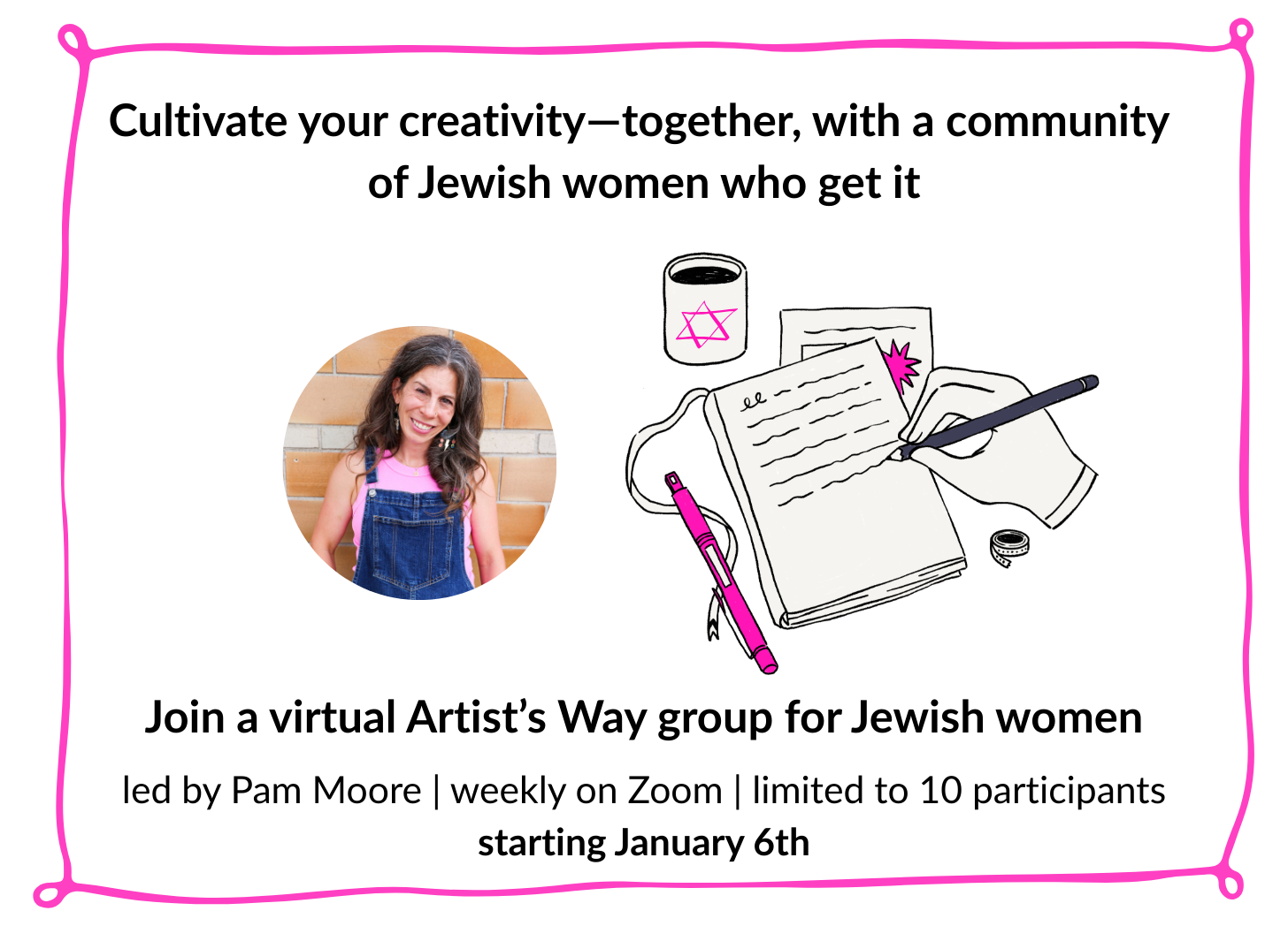Hi, I’m Pam Moore! I’m a writer, stand-up comedian, and creative community builder for Jewish women.